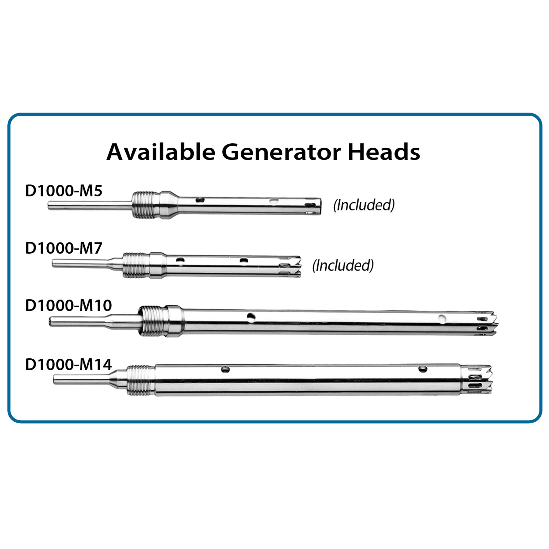 Generator probes are available in four sizes. The 5mm and 7mm diameter have a 50mm length for use with samples in microbtubes. The 10mm x 115mm is ideal for use with 15 and 50ml tubes and 14mm x 130 mm, for 50ml tubes and vessels up to 250ml. The unit is supplied with one each of the 5mm and 7mm generator probes.?All the generator probes are made of stainless steel and can be sterilized by autoclaving.