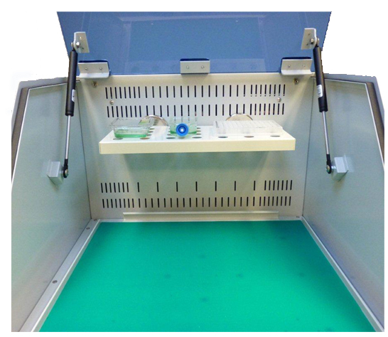 - Optional shelf for Petri dishes, microplates, etc.