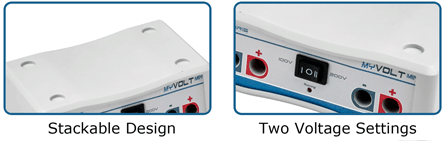 Two sets of output jacks are available to connect up to 2 gel rigs and the instruments can securely be stacked for use with additional gel rigs.