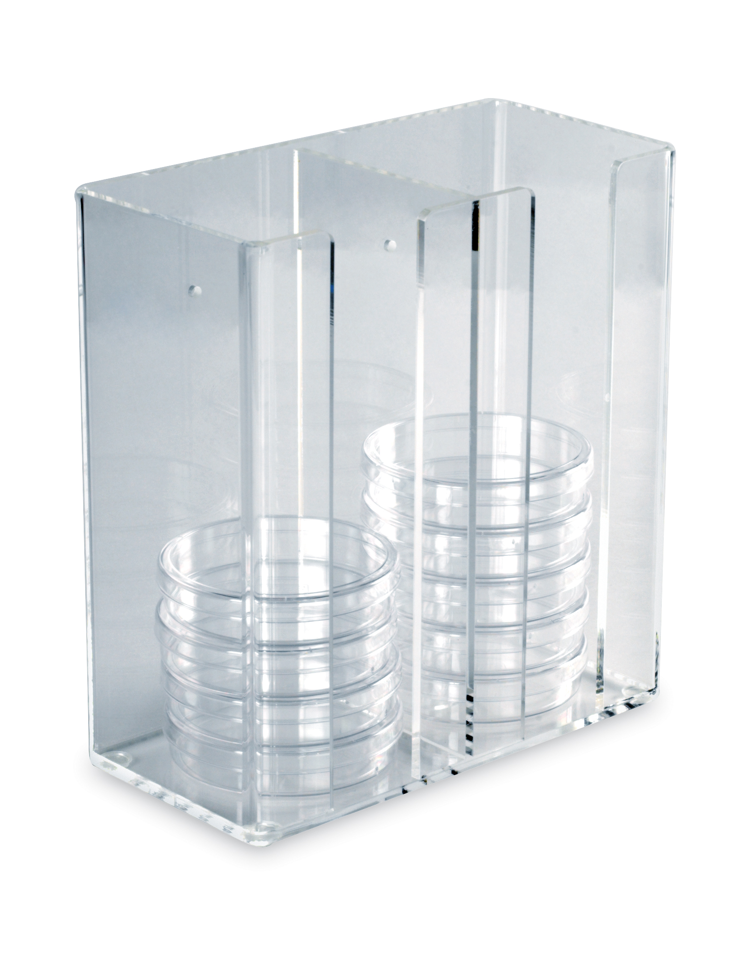 • Sturdy acrylic holds up to 30 x 100 mm dishes in two easy-access partitions