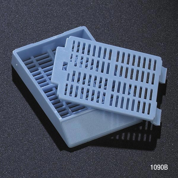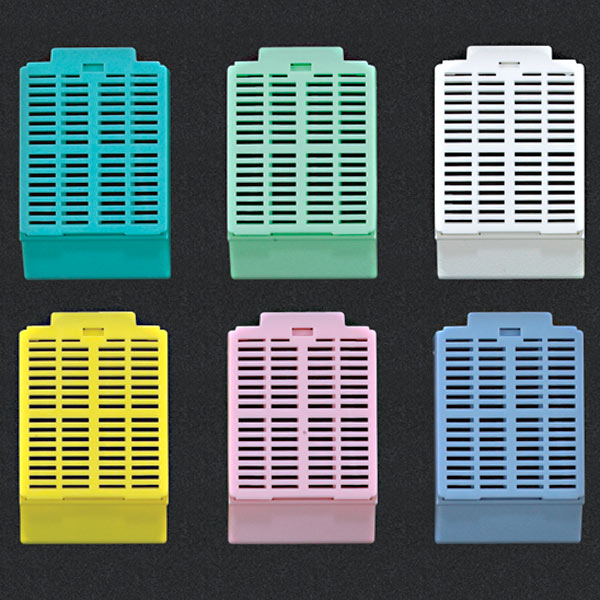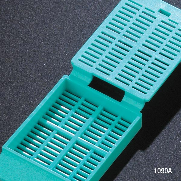 The 30° angled cassette features an extra-large writing surface and two side panels ideal for labeling. The cassette has an integral lid that snaps apart and securely locks into the base of the cassette. The lid can be removed and reattached repeatedly to access the specimen. Note: These cassettes are not suitable for use on cassette printers.